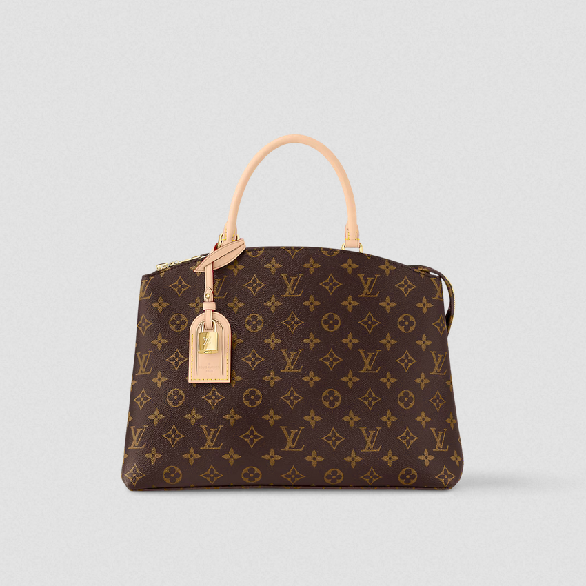 Inspired by the iconic Lockit from 2011 and the shape of the Montaigne launched in 2014, the new Grand Palais tote is as versatile as it is feminine. Made from Monogram canvas with natural-leather trim, its interior features a vivid red lining and a Louis Vuitton patch. The removable strap and top handles give carry options.