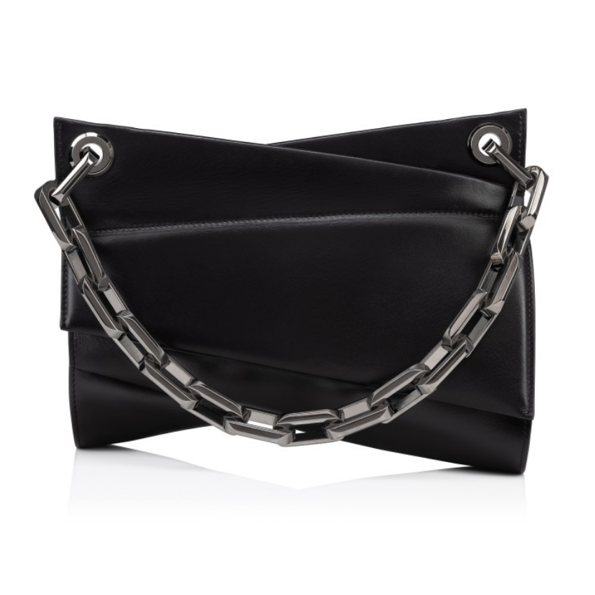 The unique shape of the Loubitwist clutch has been reworked with a chain strap for over-the-shoulder wear. This model in smooth black calf leather showcases Maison Christian Louboutin's savoir-faire. The creator's signature adorns the back.