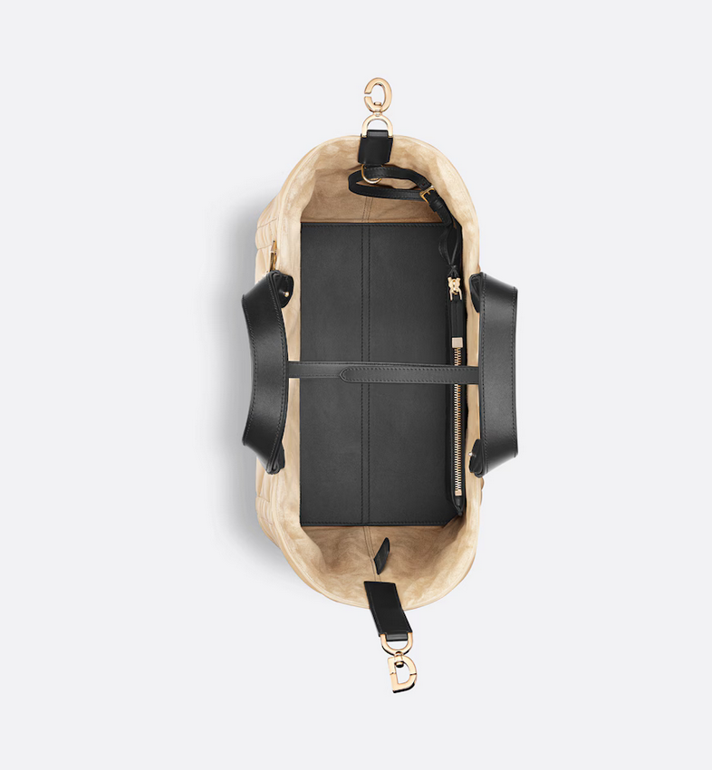 The Dior Toujours bag is distinguished by a casual and practical design. Crafted in rope beige calfskin with Macrocannage topstitching and black calfskin detailing, it showcases a spacious interior compartment with a matching pouch to organize the essentials. Its thin leather strap closure keeps items secure while the D of the CD Lock clasp twists to adjust the sides and enhance the bag's silhouette. The leather top handles can be adjusted using the small notches so the medium bag can be carried by hand or worn over the shoulder.