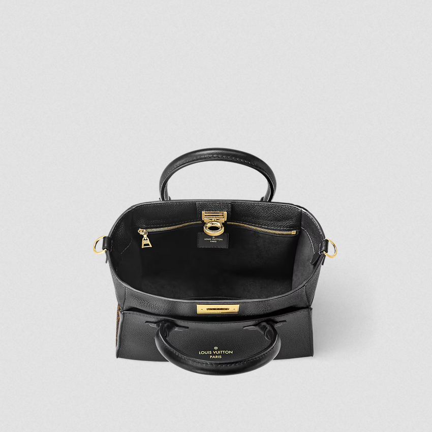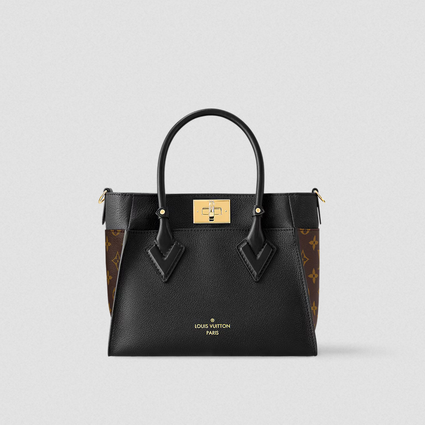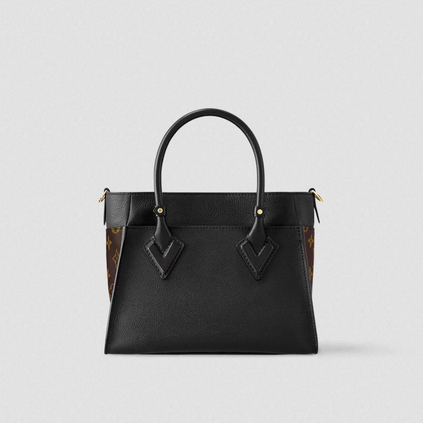 The On My Side PM is a compact tote bag made from soft calf leather with side panels in classic Monogram canvas. This adorable everyday bag boasts a wide removable strap for on-trend shoulder and cross-body wear as well as two top handles for hand and elbow carry. Two large outside pockets give easy access to essentials.
